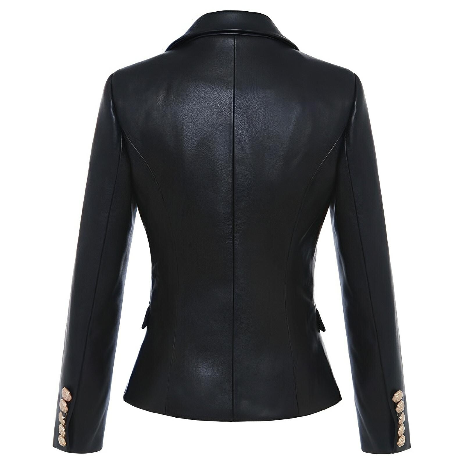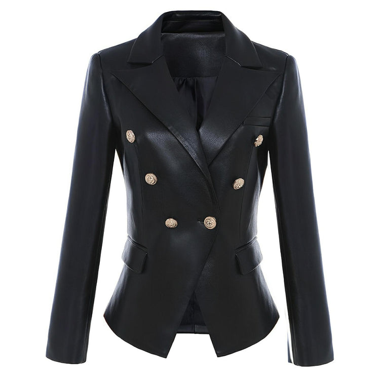 This stylish double-breasted blazer features a chic design, showcasing smooth leather fabric that adds depth. The blazer has a classic lapel, and the body is embellished with polished buttons that enhance its luxurious appeal. The sharp, tailored fit emphasizes a sophisticated silhouette, making it suitable for both formal and casual occasions. Leave a lasting impression.