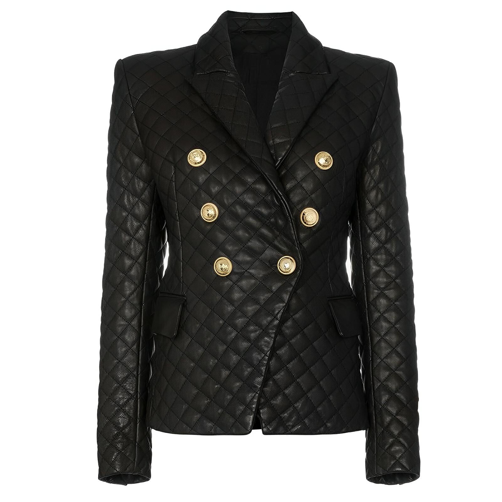 This double-breasted blazer features an eye-catching faux leather exterior, showcasing a quilted pattern that adds depth. The blazer has a classic lapel design, embellished with polished buttons that enhance its luxurious appeal. The sharp, tailored fit emphasizes a sophisticated silhouette, making it suitable for both formal and casual occasions. Leave a lasting impression.