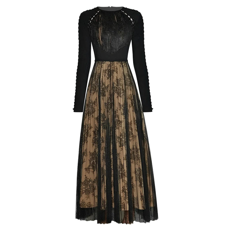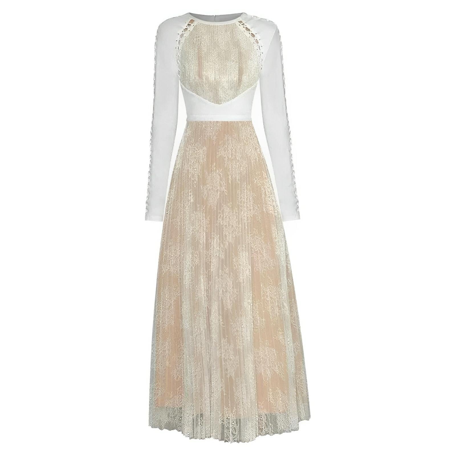 This stunning dress features elegant long sleeves with intricate embroidery adorning both the bodice and skirt. Flowing gracefully to a floor-length hem, the skirt is embellished with more embroidered motifs and delicate lace trim at the base, lending an ethereal quality. This dress is perfect for formal occasions, adding a romantic touch to any event. Be unforgettable.