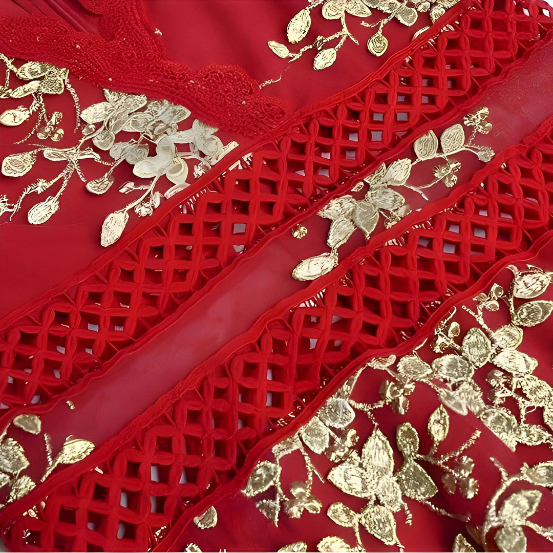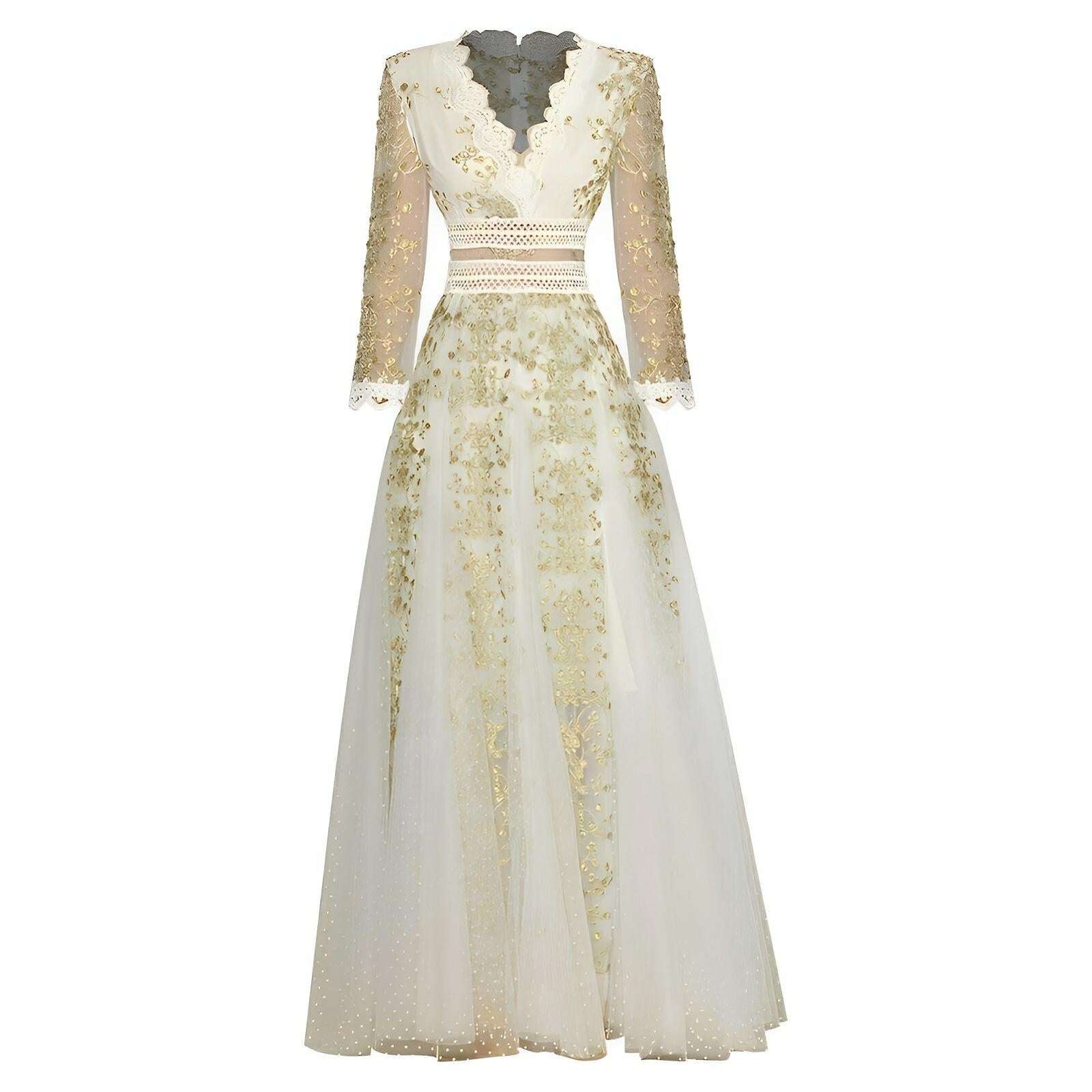 This enchanting gown features elegant mesh sleeves with embroidered detailing adorning both the bodice and skirt. Flowing gracefully to a floor-length hem, the skirt is embellished with more embroidered motifs and delicate lace trim at the base, lending an ethereal quality. This dress is perfect for formal occasions, adding a romantic touch to any event. Be unforgettable.