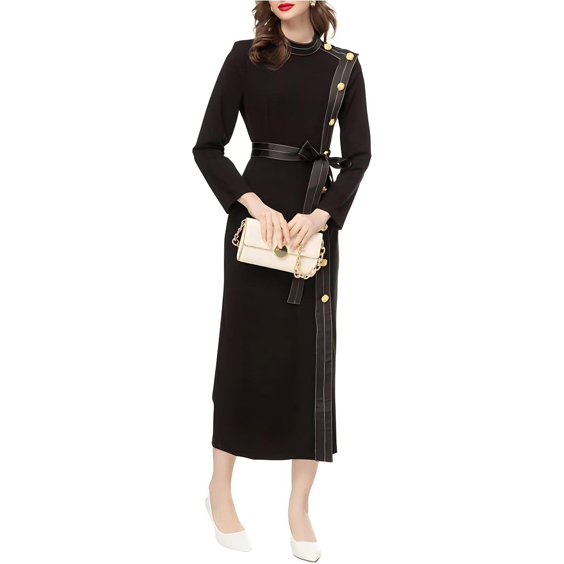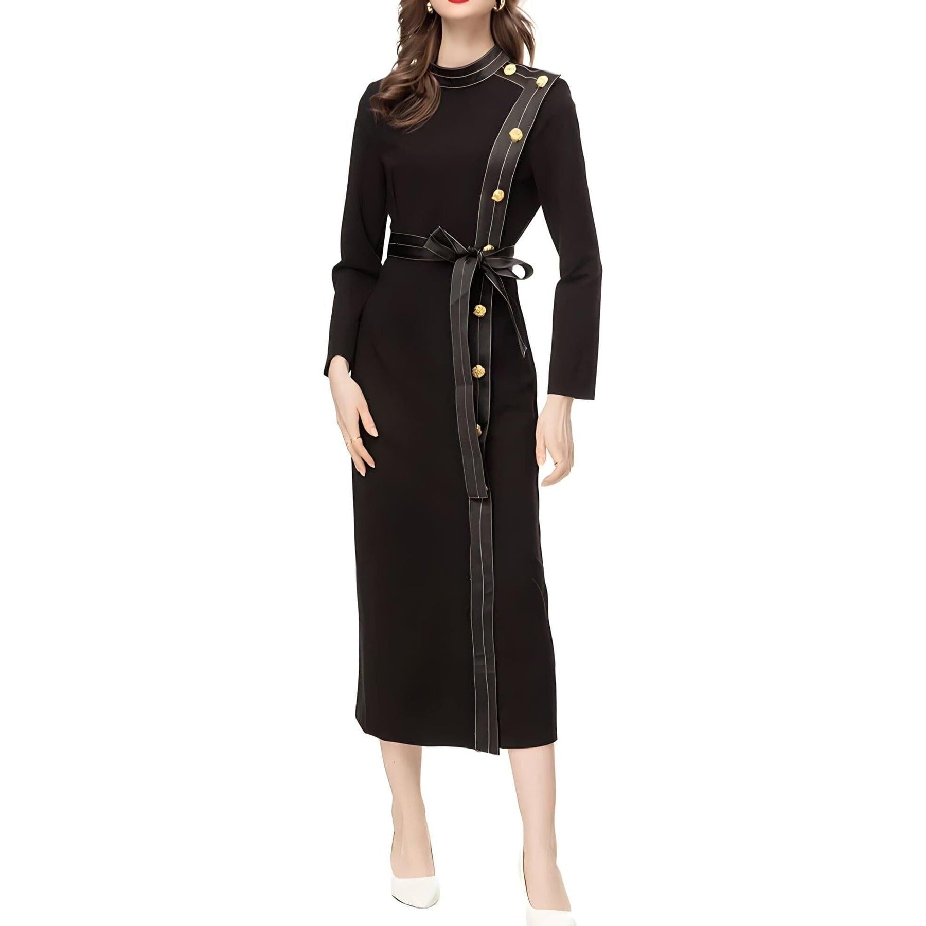 This elegant black dress features sophisticated gold buttons set against soft and flowing fabric. The fitted waist accentuates the curves, elegantly defining the silhouette. The versatile mid-length cut completes the dress's refined and feminine aesthetic, making it suitable for semi-formal events or special occasions. Own the moment.