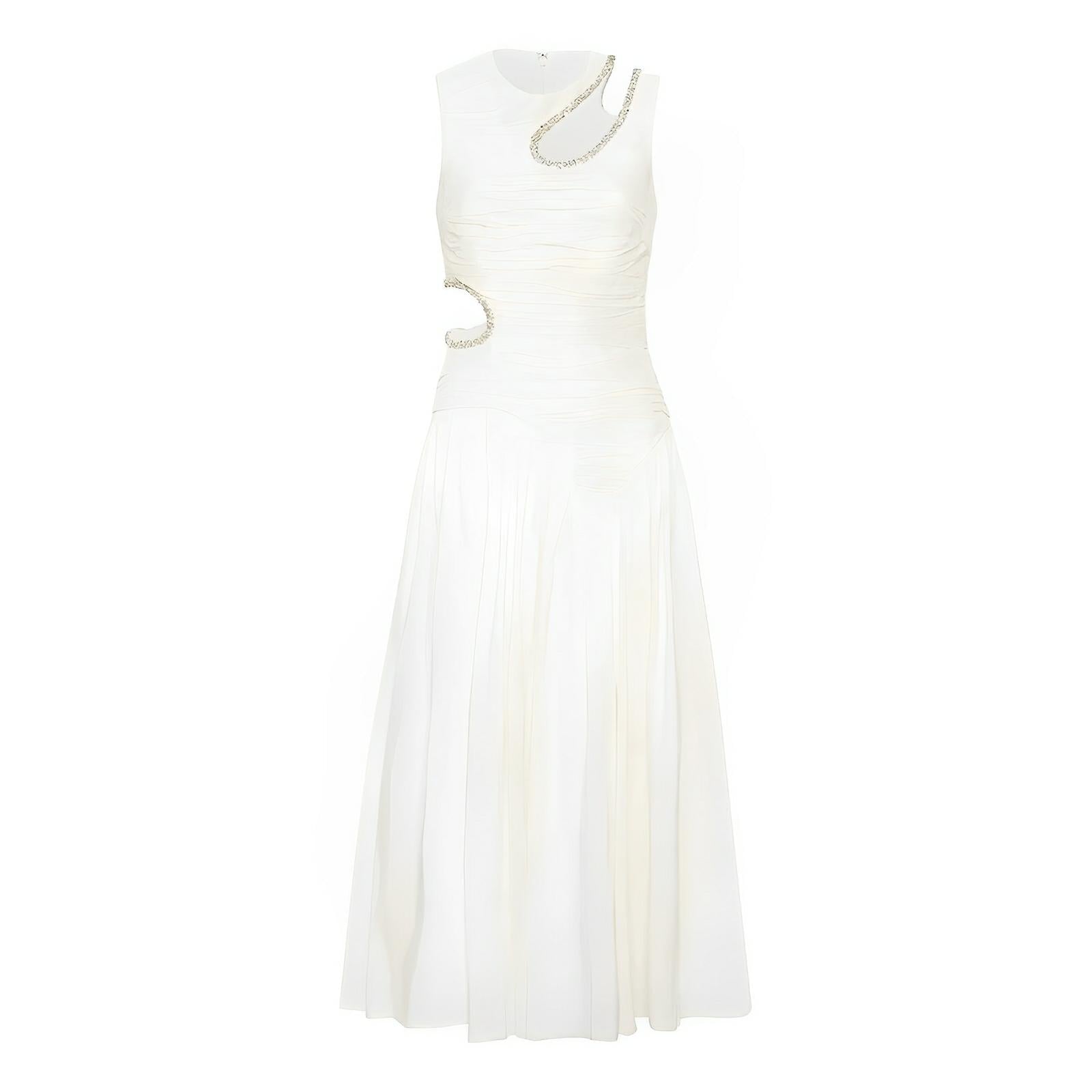 This elegant crystal-adorned midi dress offers a luxurious and versatile foundation for various occasions. The skirt flows gracefully, with pleats adding movement and depth to the overall design. Perfect for formal events or special occasions, this dress effortlessly combines style with comfort. Own the moment.