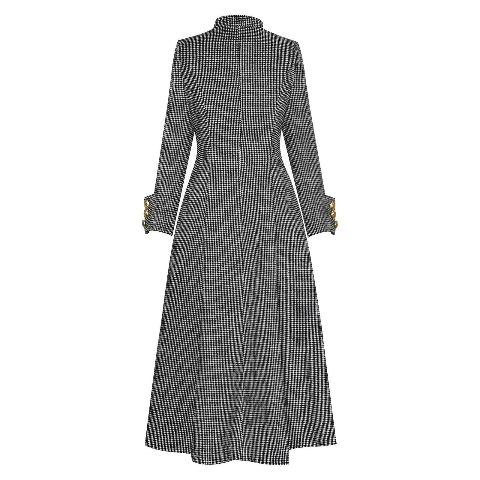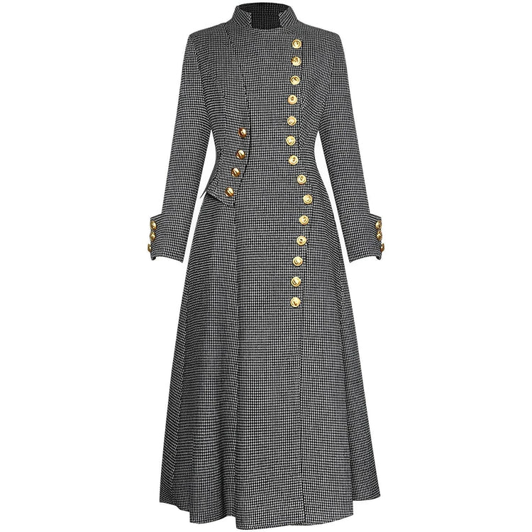 This sophisticated long-sleeve dress features polished gold buttons set against soft and flowing fabric. The cinched waist accentuates the curves, elegantly defining the silhouette. The versatile mid-length cut completes the dress's refined and feminine aesthetic, making it perfect for formal events or special occasions. Own the moment.