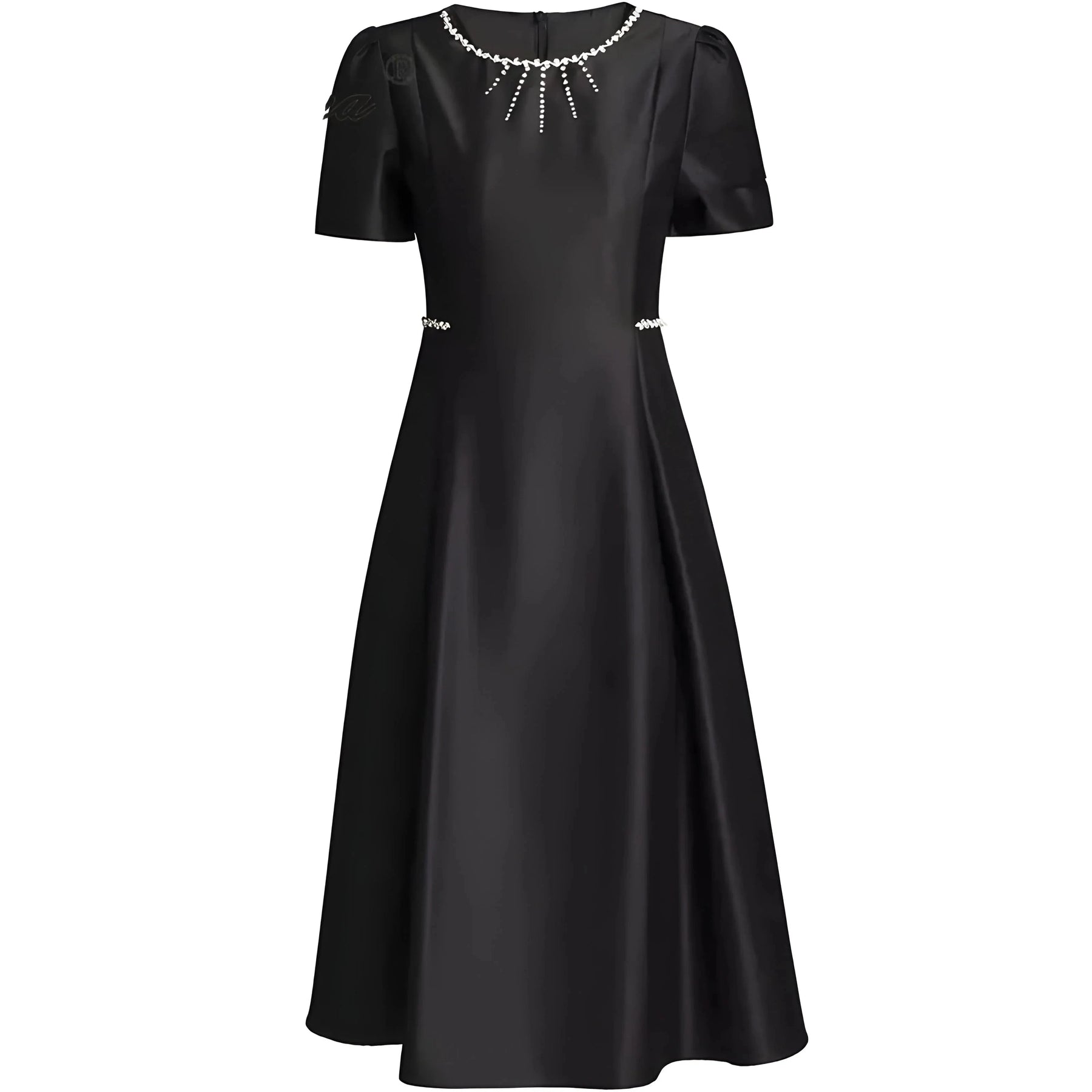 This elegant dress features sophisticated rhinestone detailing set against soft and flowing fabric. The fitted waist accentuates the curves, elegantly defining the silhouette. The versatile mid-length cut completes the dress's refined and feminine aesthetic, making it suitable for formal events or special occasions. Own the moment.