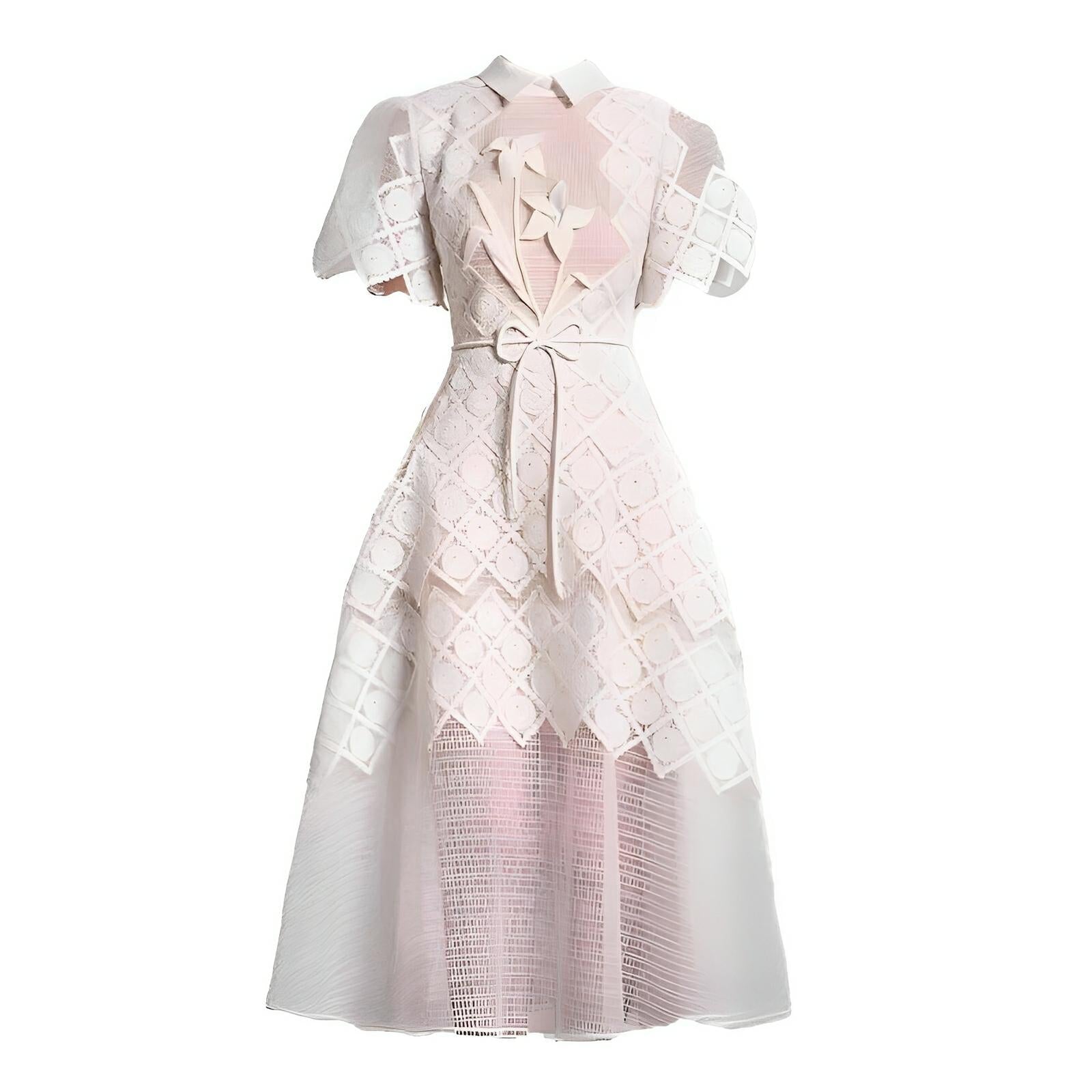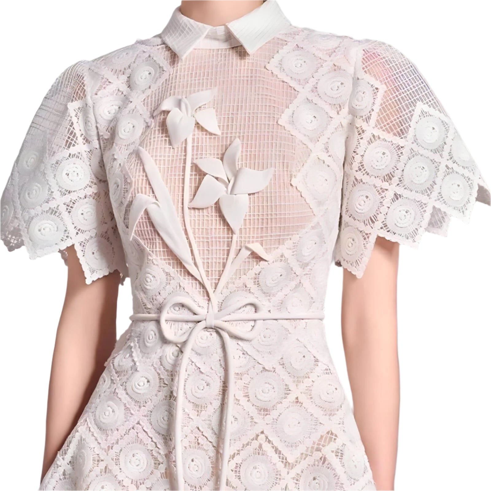 This enchanting dress features elegant short sleeves with intricate embroidery adorning both the bodice and skirt. Flowing gracefully to a mid-length hem, the skirt is embellished with more embroidery motifs and delicate lace trim at the base, lending an ethereal quality. This dress is perfect for formal occasions, adding a romantic touch to any event. Be unforgettable.
