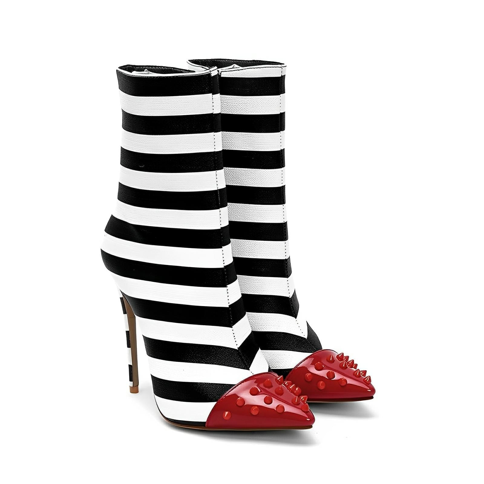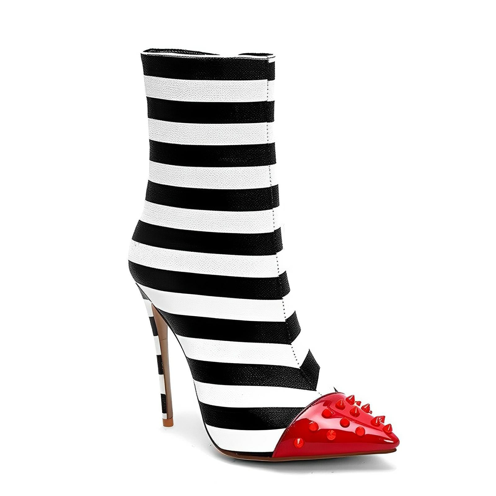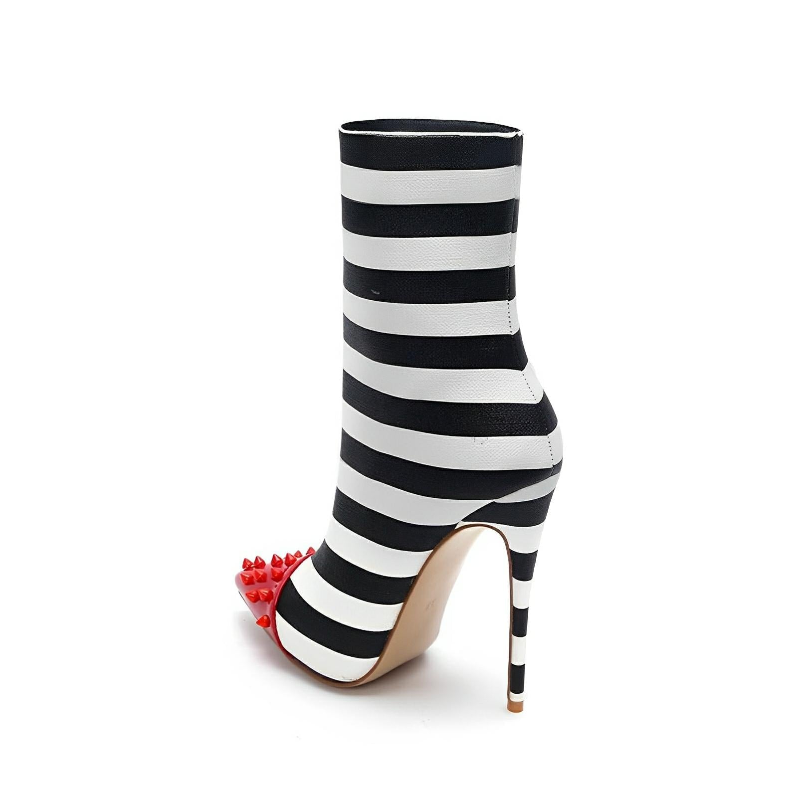 This striking ankle boot features a studded pointed toe, and a sleek, fitted silhouette. The boot has a stiletto heel with a sophisticated outline, providing modern flair while maintaining stability. This bold footwear choice is perfect for making a statement in both casual and formal settings. Own every moment.