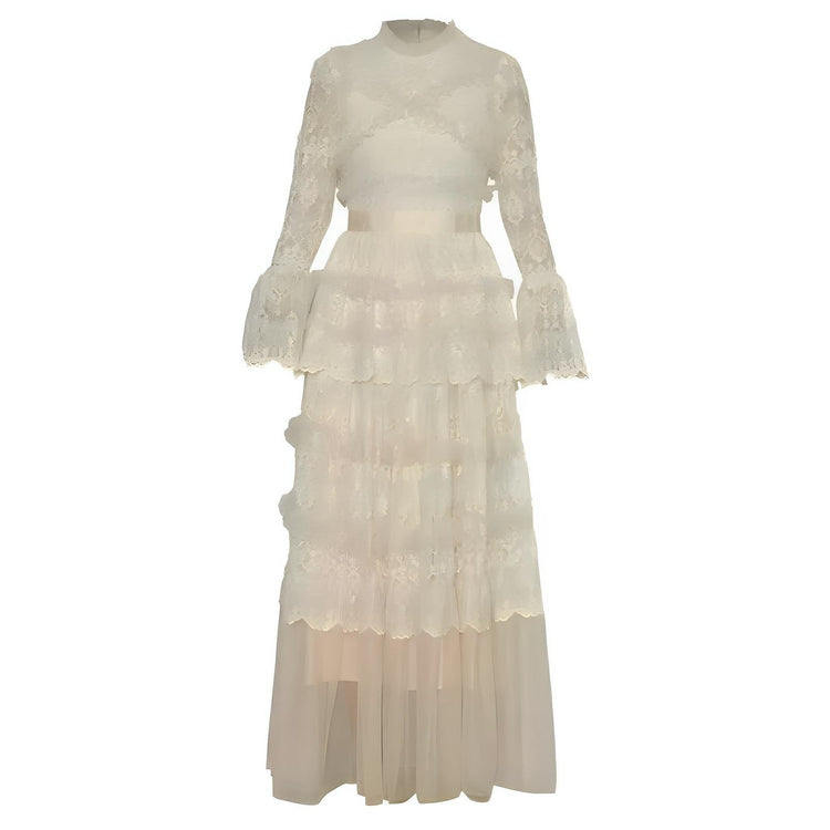 This luxurious mesh-sleeve dress features sophisticated detailing set against soft and flowing fabric. The fitted waist accentuates the curves, elegantly defining the silhouette. The graceful floor-length hem completes the dress's refined and feminine aesthetic, making it perfect for formal events or special occasions. Own the moment.