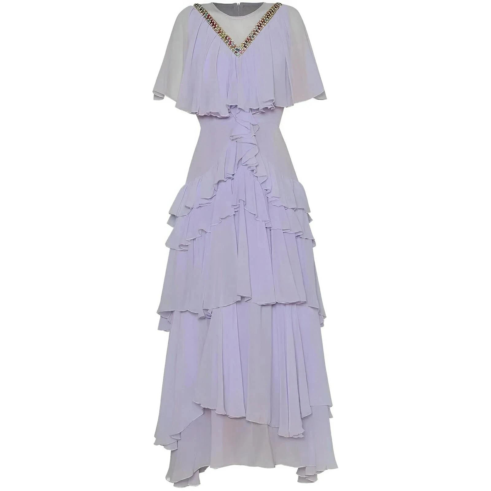 This enchanting dress features elegant short sleeves with intricate crystal detailing adorning the bodice. Flowing gracefully to a floor-length hem, the skirt is embellished with ruched detailing and delicate lace trim at the base, lending an ethereal quality. This dress is perfect for formal occasions, adding a romantic touch to any event. Be unforgettable.