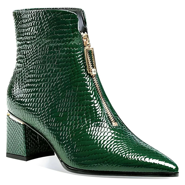 This striking ankle boot features a pointed toe design, and a sleek, fitted silhouette. The boot has a stylish block heel with a sophisticated outline, providing modern flair while maintaining stability. This bold footwear choice is perfect for making a statement in both casual and formal settings. Own every moment.