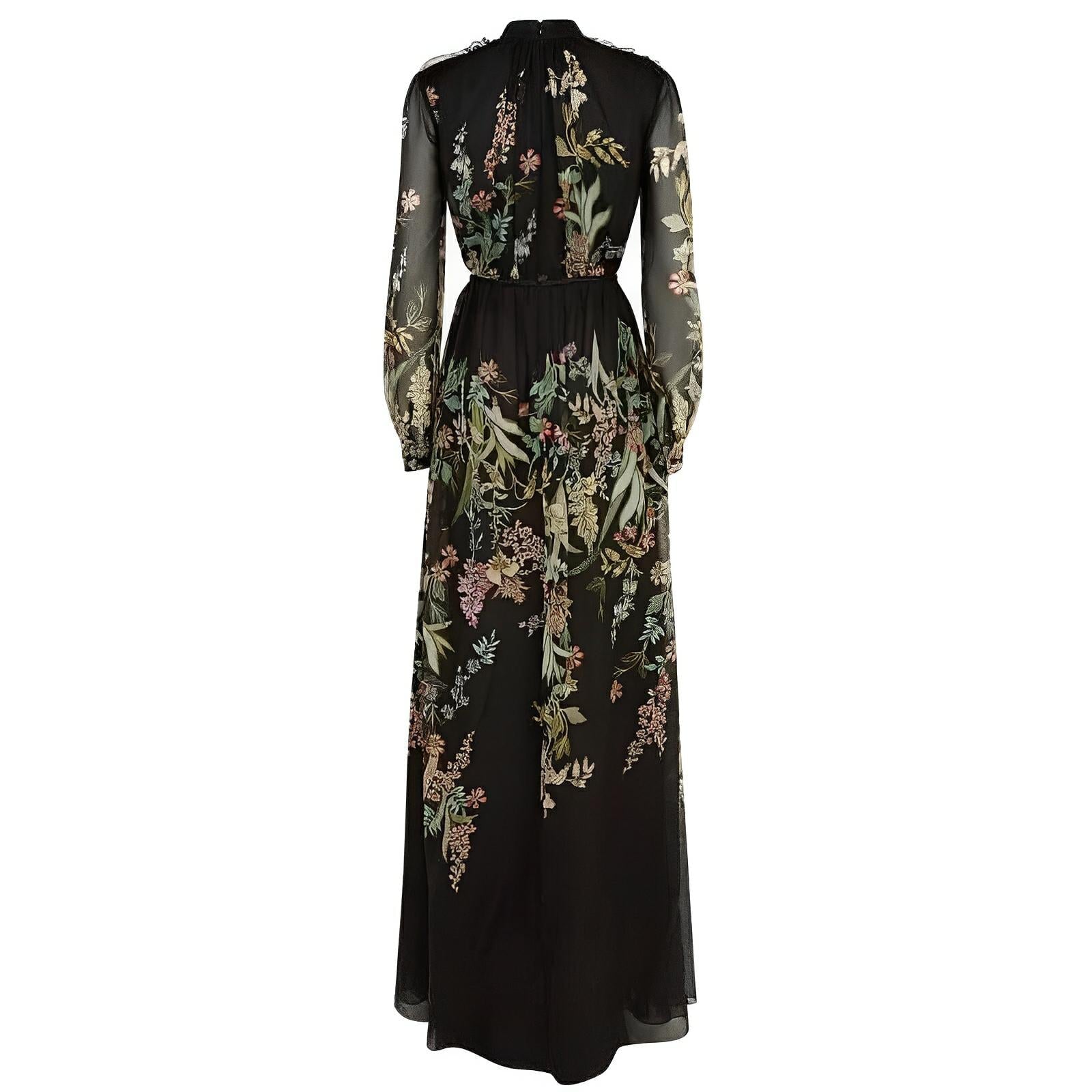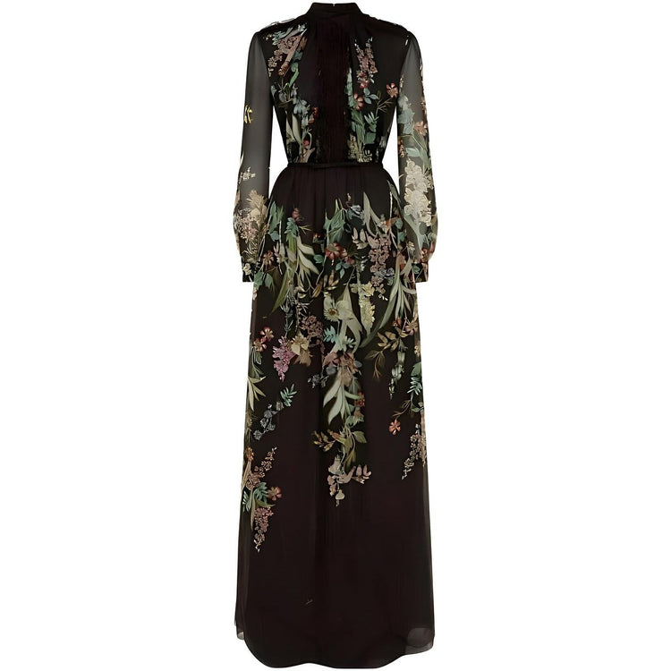 This elegant long-sleeve dress features luxurious floral detailing set against soft and flowing fabric. The fitted waist accentuates the curves, elegantly defining the silhouette. The graceful floor-length hem completes the dress's refined and feminine aesthetic, making it ideal for formal events or special occasions. Own the moment.