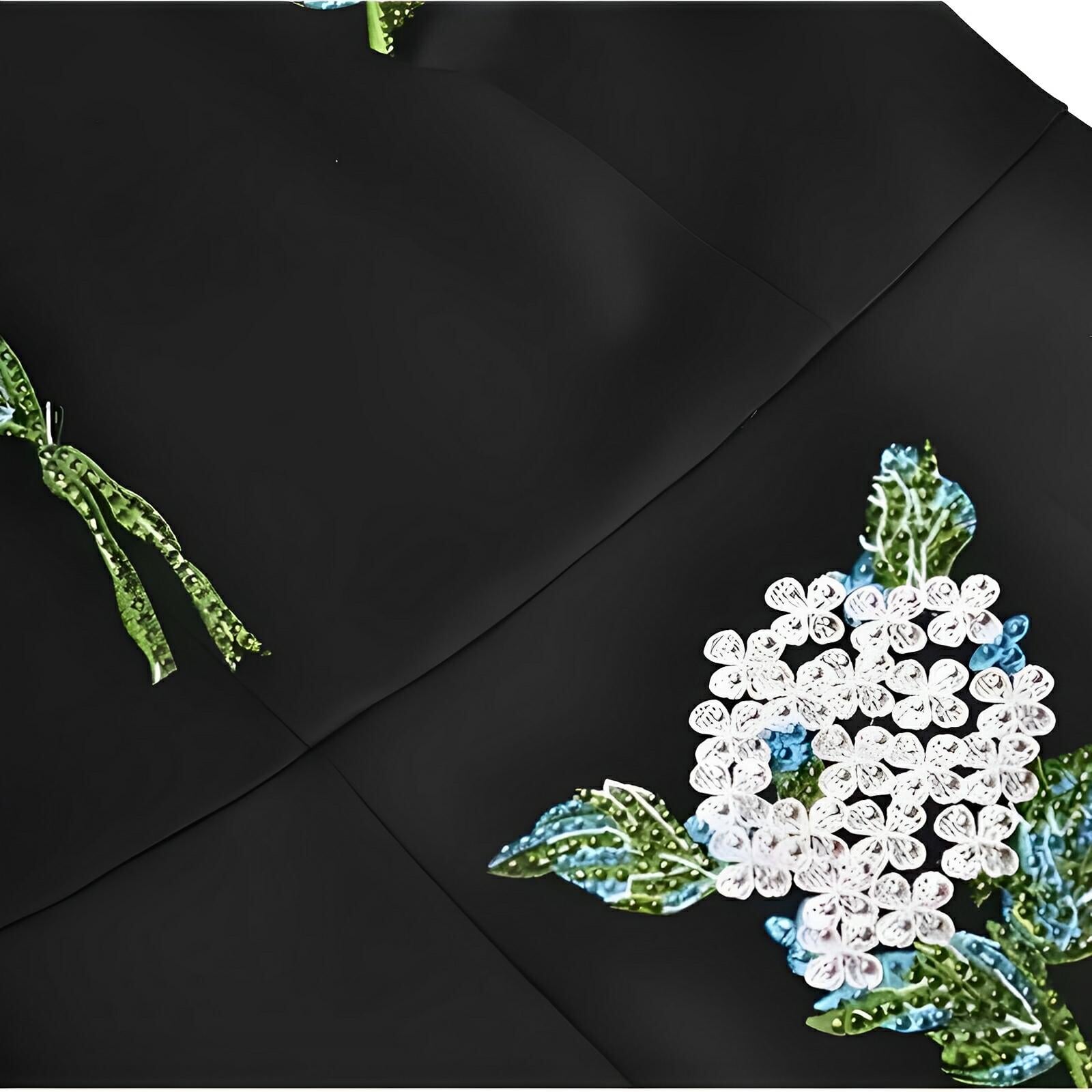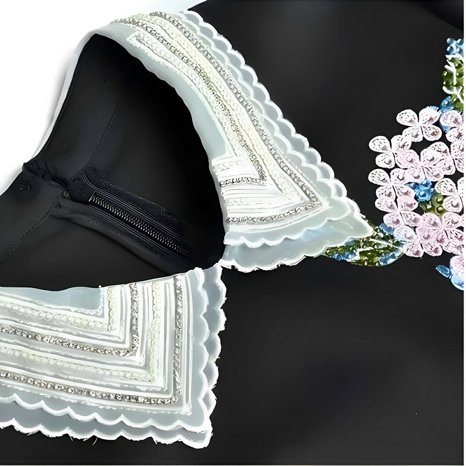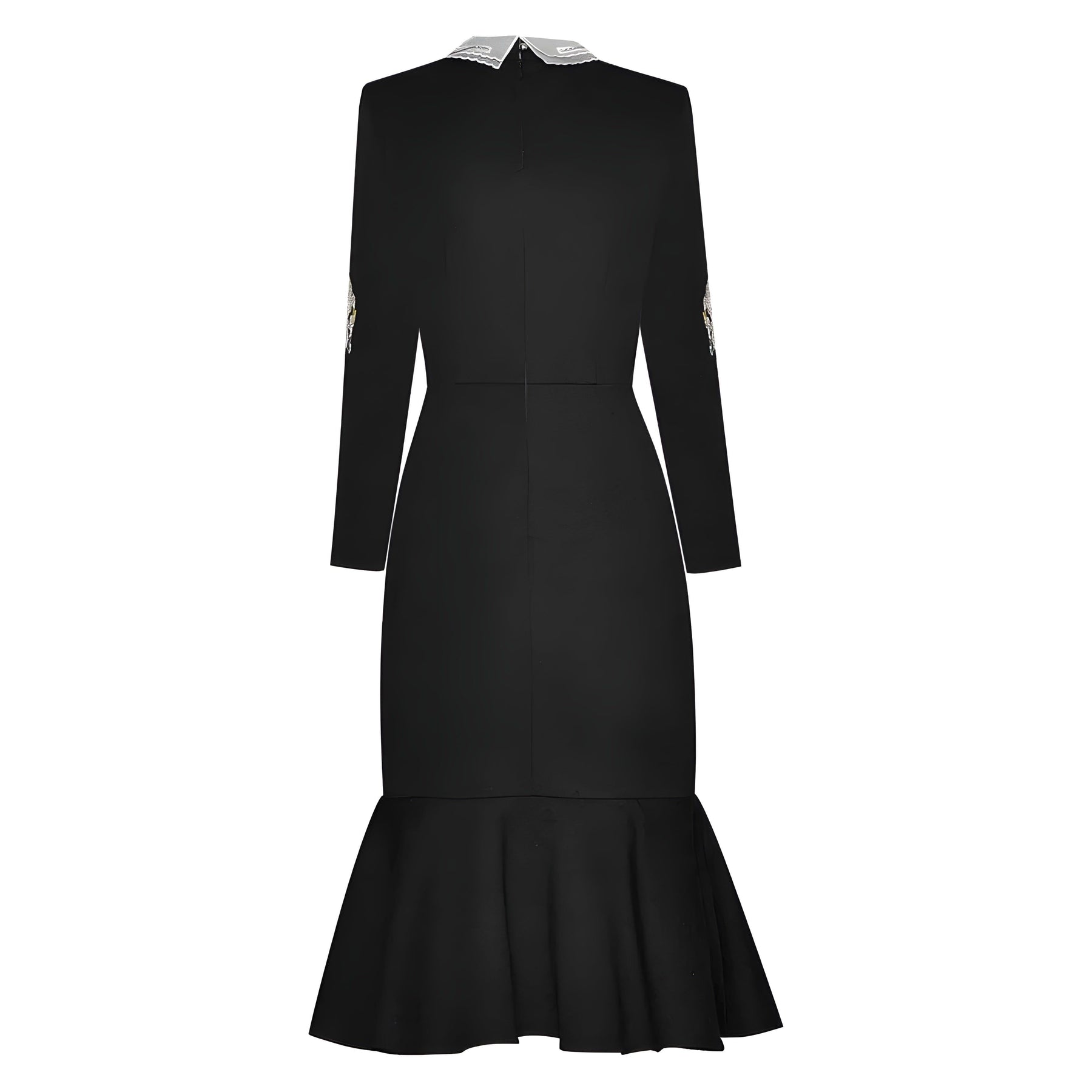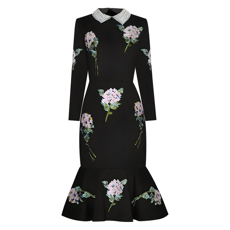 This elegant dress features sophisticated embroidery set against soft and flowing fabric. The fitted waist accentuates the curves, elegantly defining the silhouette. The versatile mid-length cut completes the dress's refined and feminine aesthetic, making it perfect for formal events or special occasions. Own the moment.
