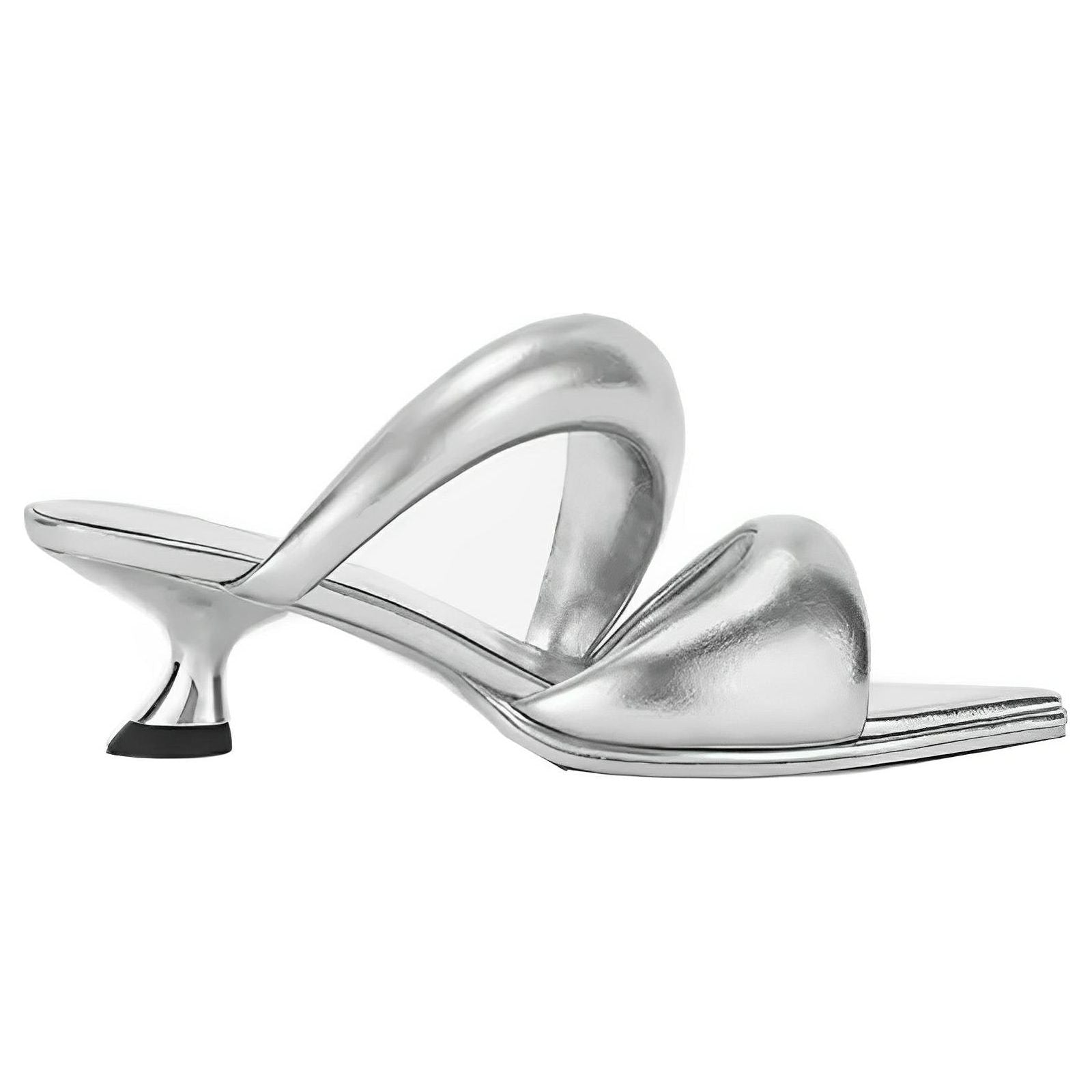 This bold pair of sandals showcase a sleek, open-toe with a luxurious finish. A unique spiral design, and sculpted heel combine to make this shoe a statement piece suitable for fashion-forward events or night outings. The overall silhouette is elegant yet sophisticated, perfect for those looking to make a lasting impression. Make heads turn.