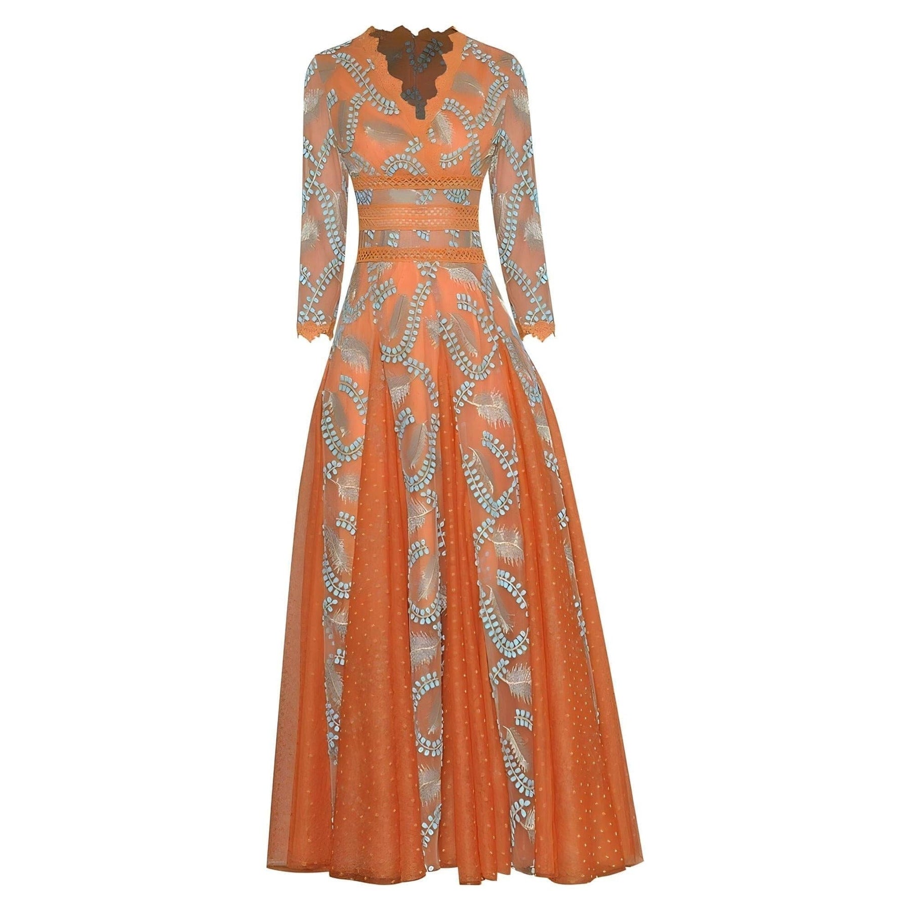 This enchanting dress features elegant long sleeves with intricate embroidery adorning both the bodice and skirt. Flowing gracefully to a floor-length hem, the skirt is embellished with more embroidered motifs and delicate lace trim at the base, lending an ethereal quality. This dress is perfect for formal occasions, adding a romantic touch to any event. Be unforgettable.