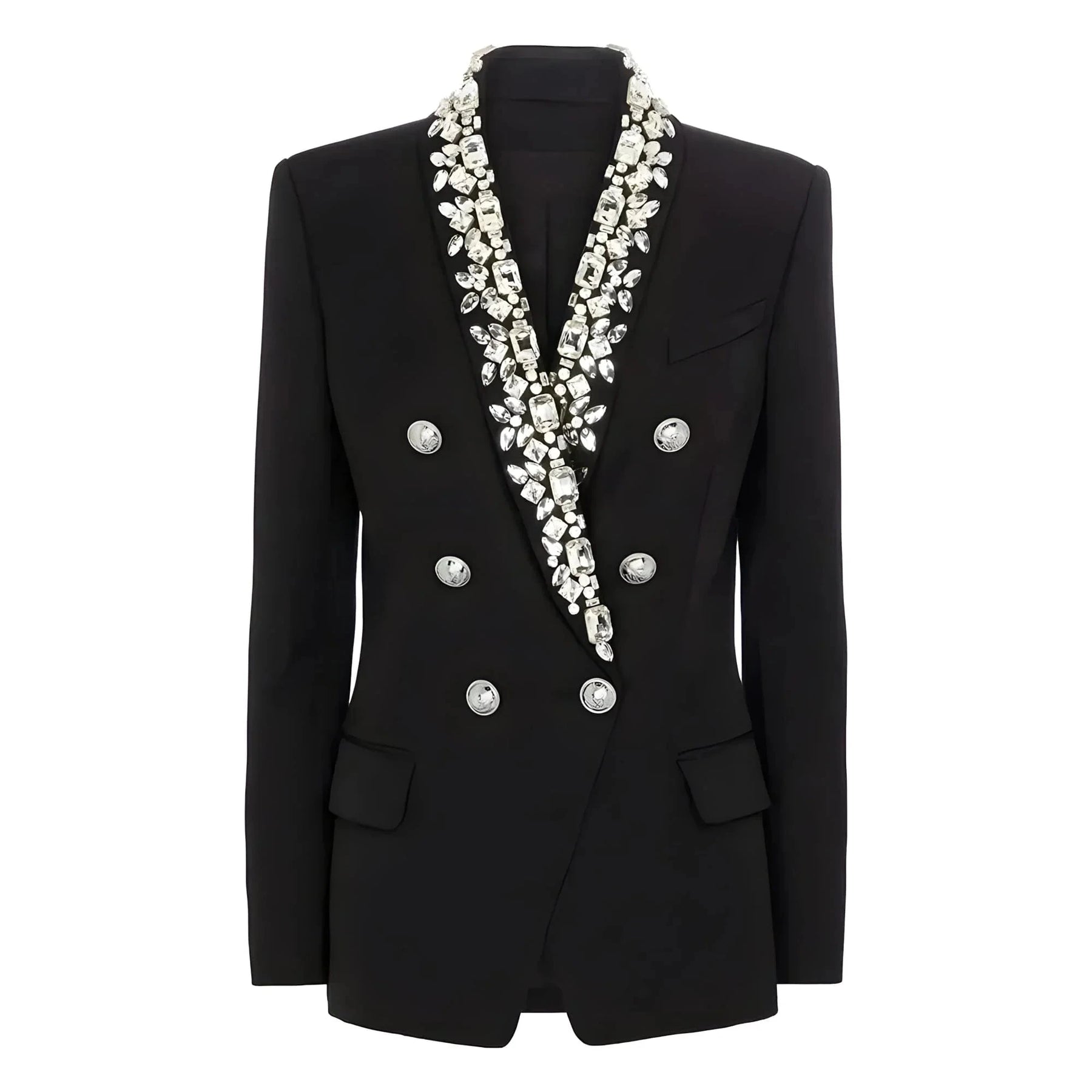 This elegant blazer features a striking double-breasted design adorned with intricate rhinestone embellishments along the lapels. The blazer has a sophisticated fit with structured shoulders and a tailored silhouette, making it suitable for formal occasions. The luxurious texture of the fabric enhances the overall opulence, while the shimmering detail adds a modern twist to a classic style. Own the room.