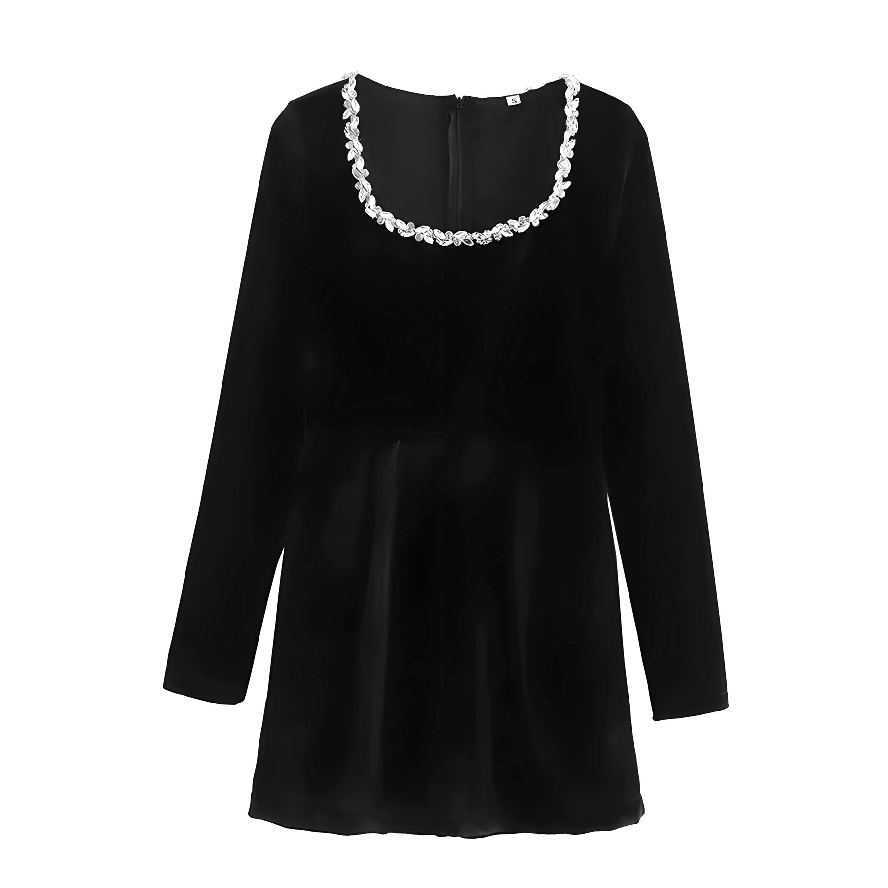 This elegant velvet dress features a flattering silhouette, accentuated with a rhinestone collar for a luxurious finish. The dress is tailored to enhance the body shape, making it suitable for both casual and semi-formal occasions. The hem rests gracefully above-the-knee, adding a fashionable touch to the overall sleek look. Embrace your allure.