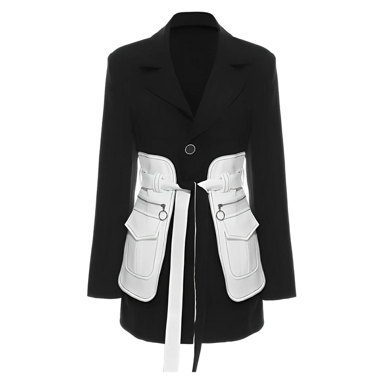 This sophisticated blazer features a classic lapel collar, and is adorned with an accent waist belt, exuding a luxuriously contemporary aesthetic. The fit is structured, providing a flattering shape that can be dressed up for formal occasions or down for a fashion-forward look. Own the room.
