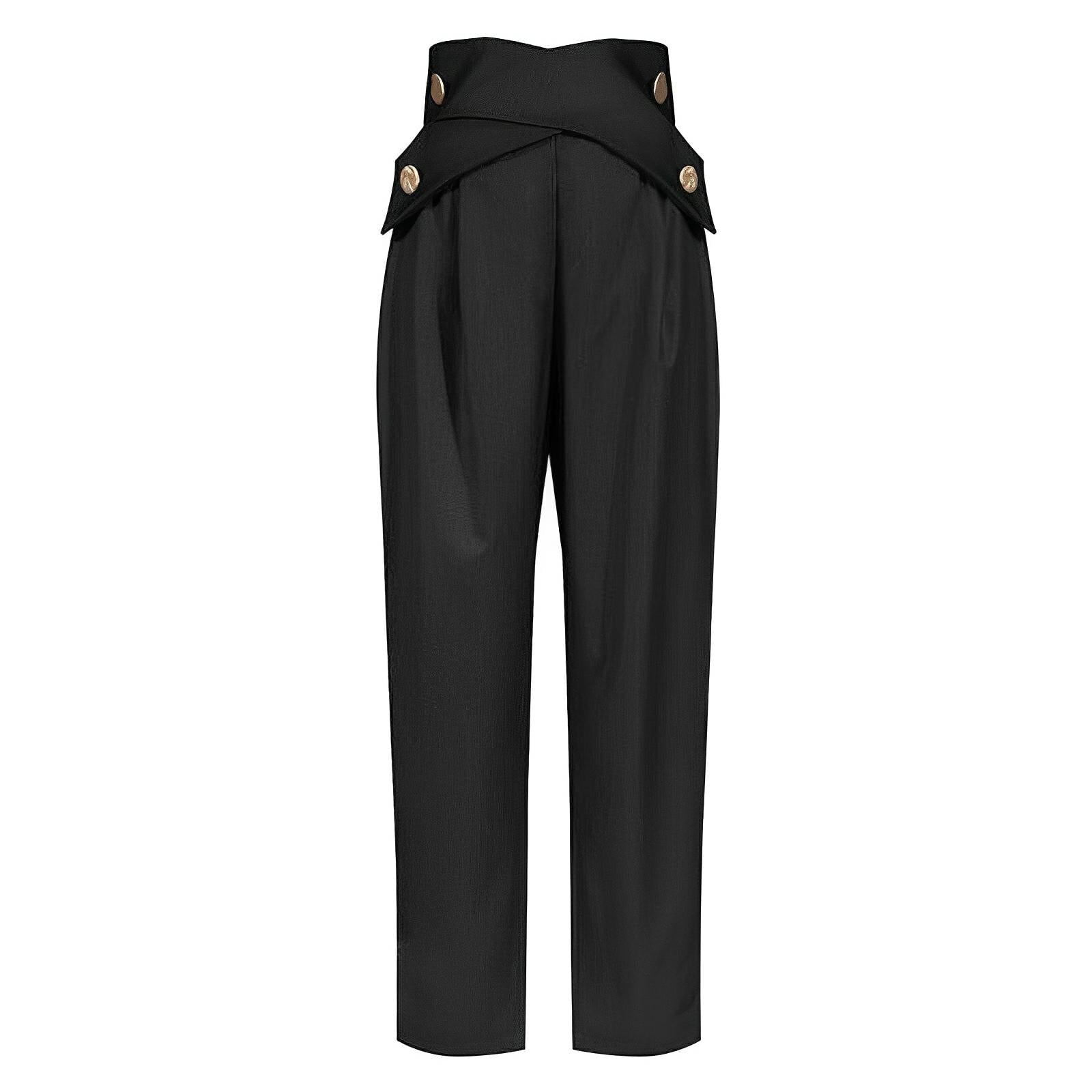 Sophisticated high-waisted bottoms with unique accent buttons for a touch of elegance. The legs are slightly flared, offering a modern silhouette while maintaining a flattering fit through the hips and thighs. Perfect for both formal and smart-casual occasions. Command presence.