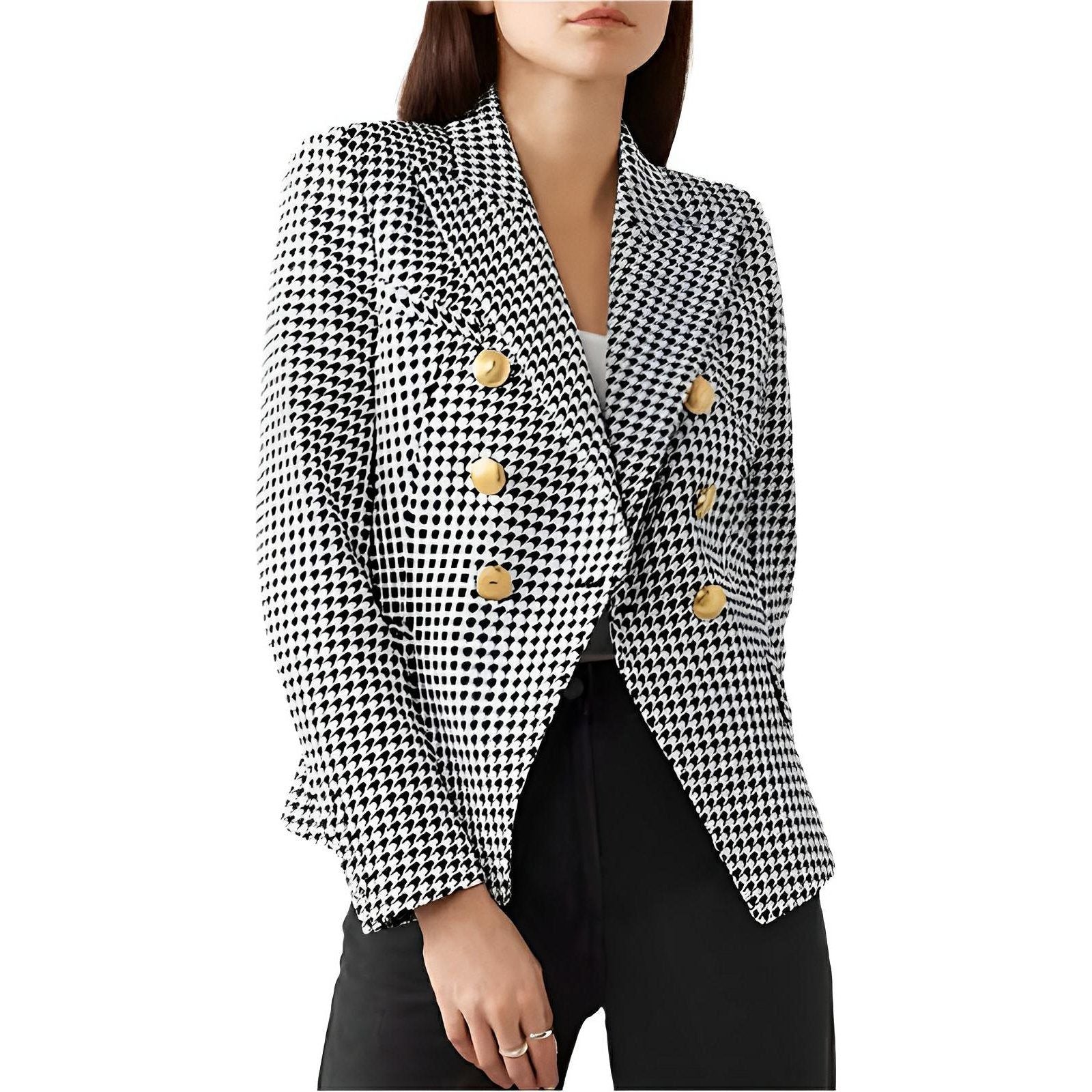 This tailored double-breasted blazer features a stylish houndstooth pattern, and is adorned with polished metal buttons, exuding a sophisticated aesthetic. The fit is structured, providing a flattering shape that can be dressed up for formal occasions or down for a smart-casual look. Command attention.