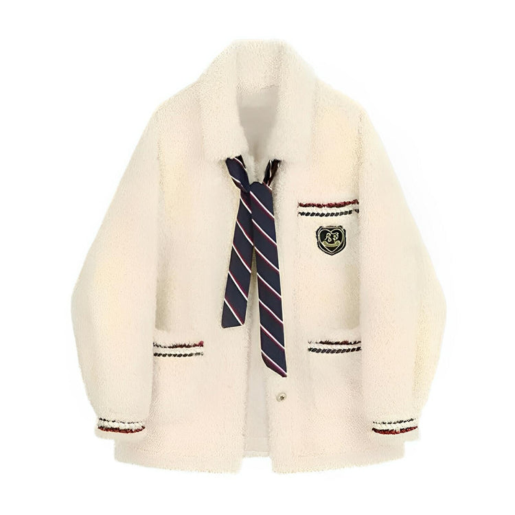 This stylish fleece coat features a relaxed silhouette with an accent necktie and a full button front. It is adorned with faux ur detailing, creating a contemporary design. The overall fit is structured yet flowing, giving it a stylish and eye-catching appearance perfect for trendy or fashionable casual occasions. Turn heads.