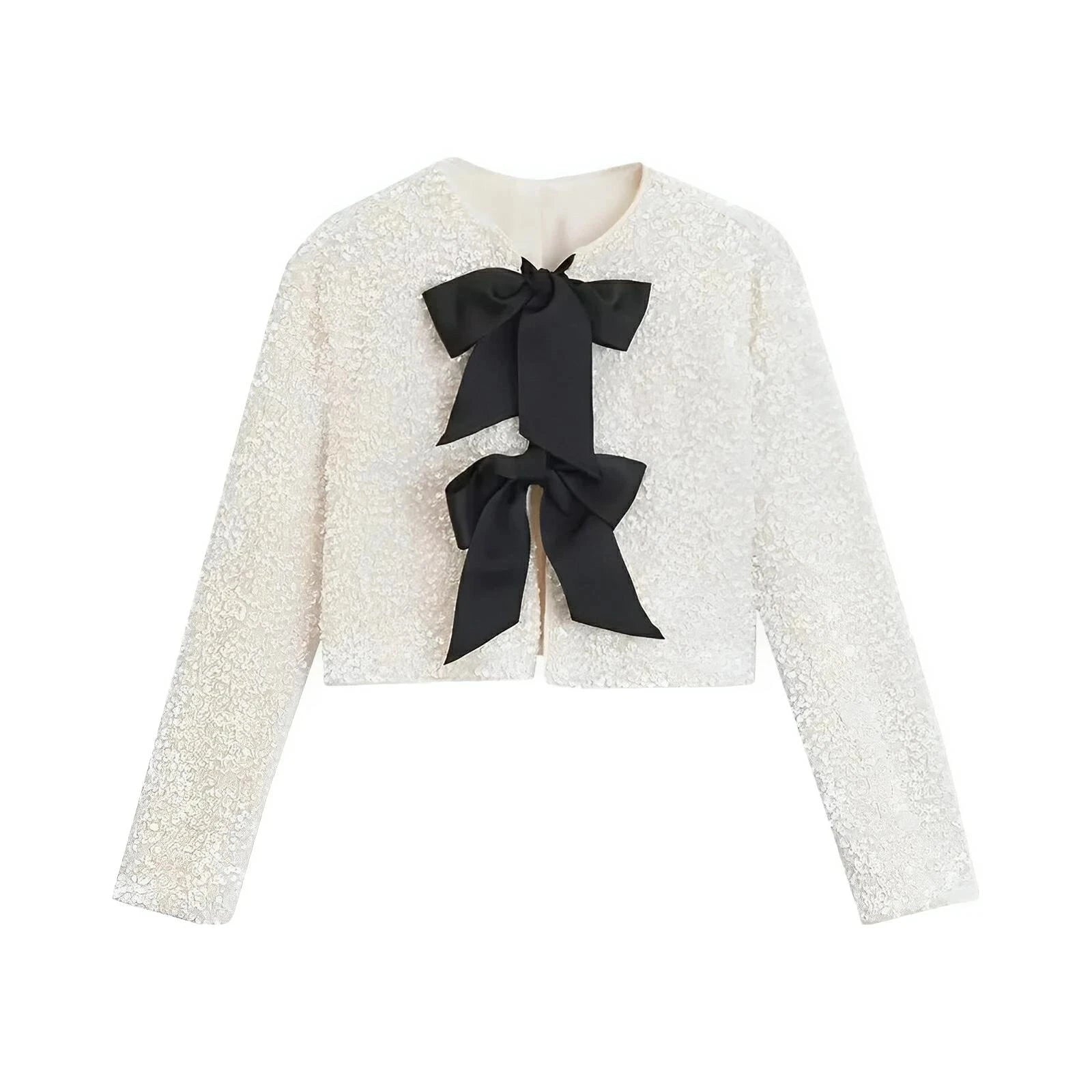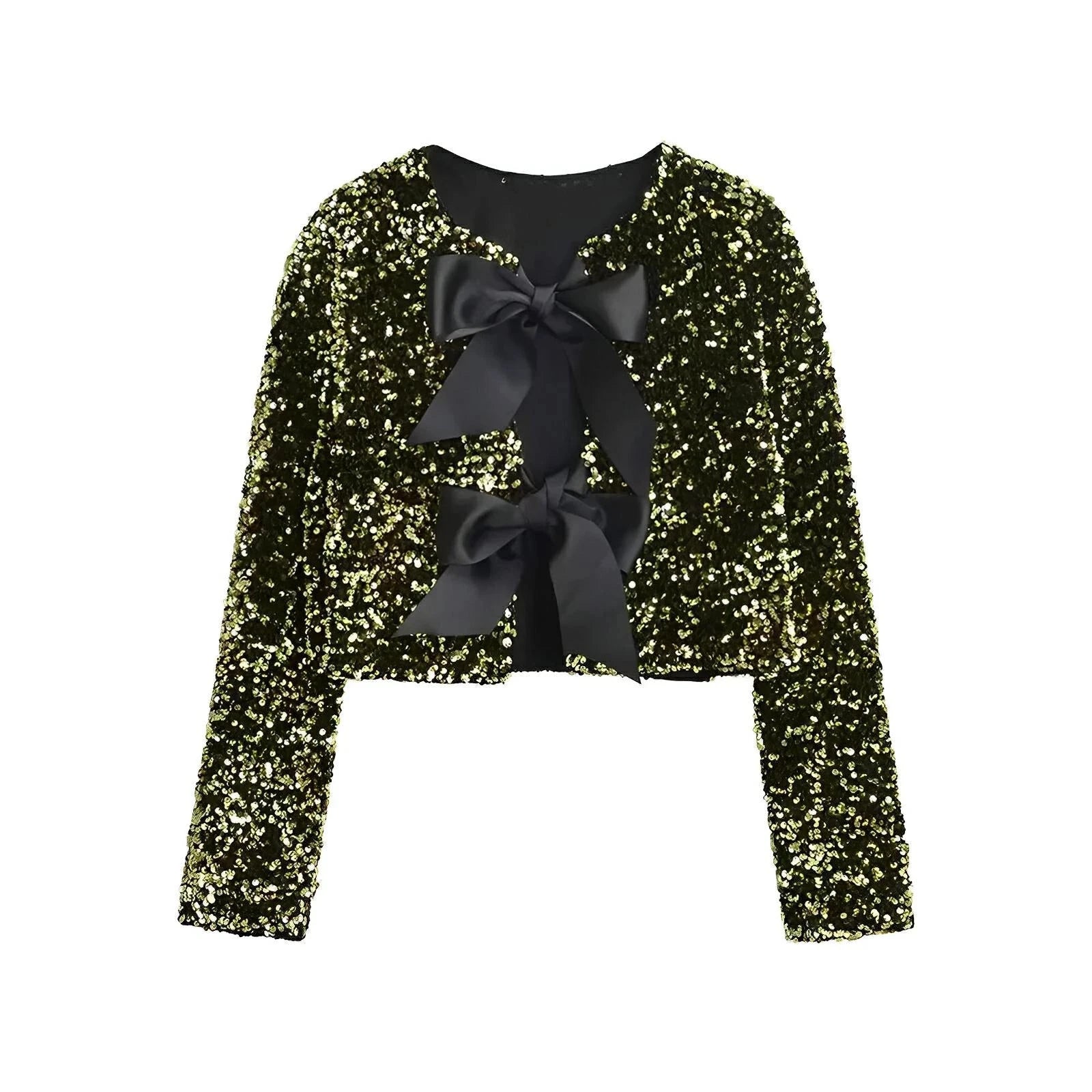 This jacket features unique sequin detailing that combines elegance with a contemporary flair. It has a stylish ribbon front and is designed with a cropped hem, adding a touch of modern sophistication. The jacket has tailored long sleeves, providing a structured silhouette that is perfect for both casual and semi-formal occasions. Command presence.