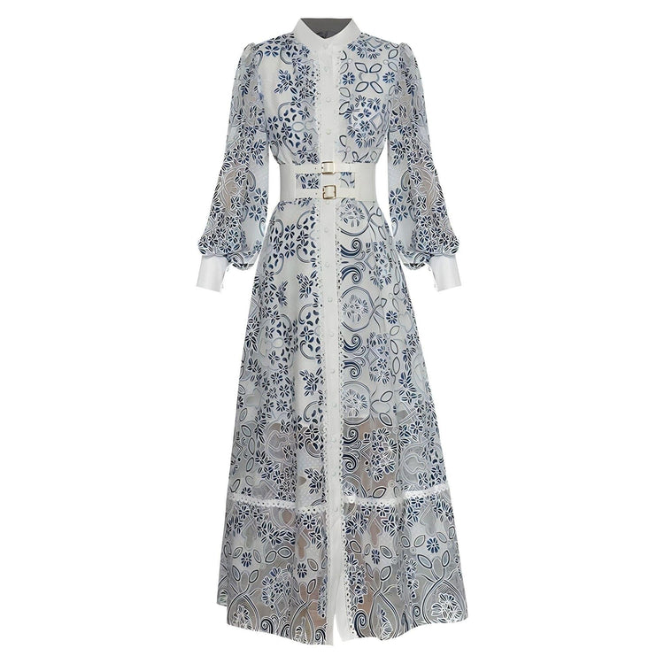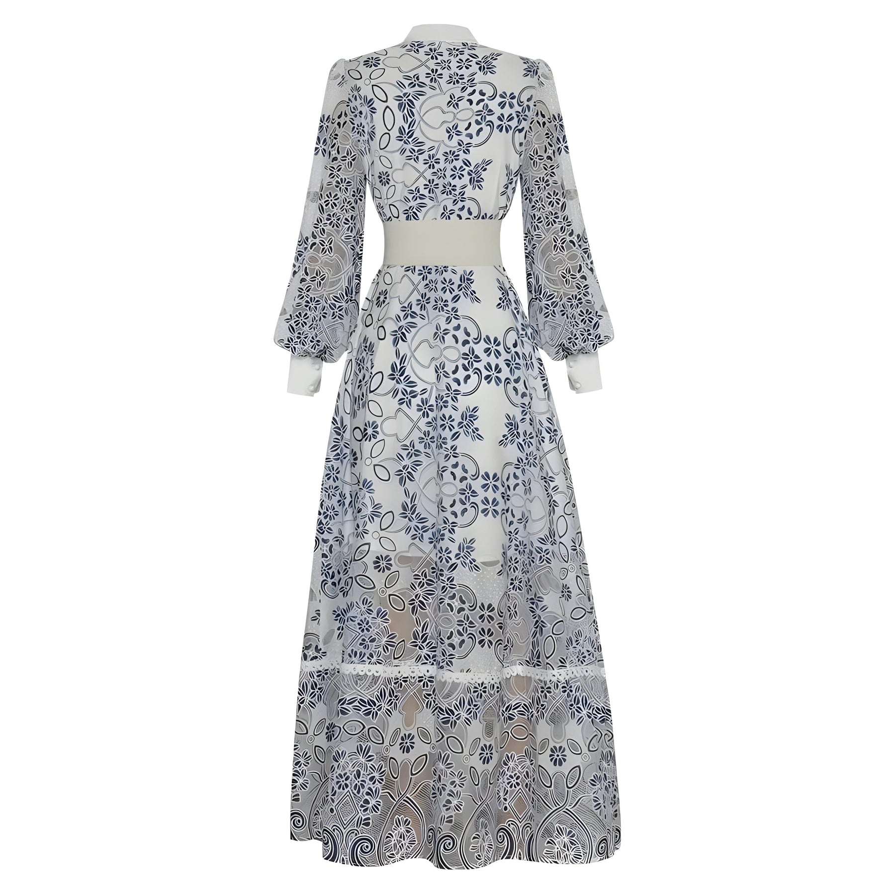 This luxurious dress features sophisticated floral detailing set against soft and flowing fabric. The fitted waist accentuates the curves, elegantly defining the silhouette. The graceful floor-length hem completes the dress's refined and feminine aesthetic, making it perfect for a soiree or formal event. Be unforgettable.