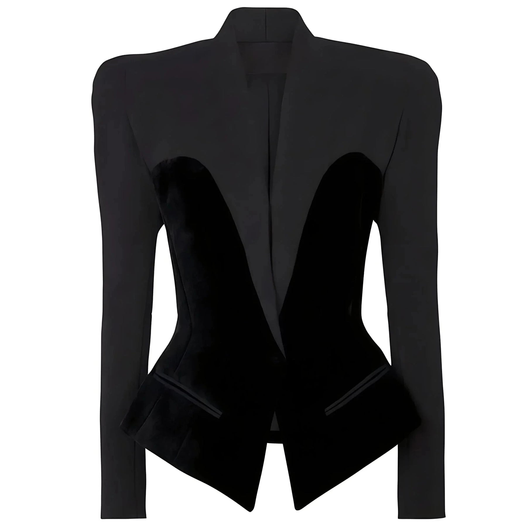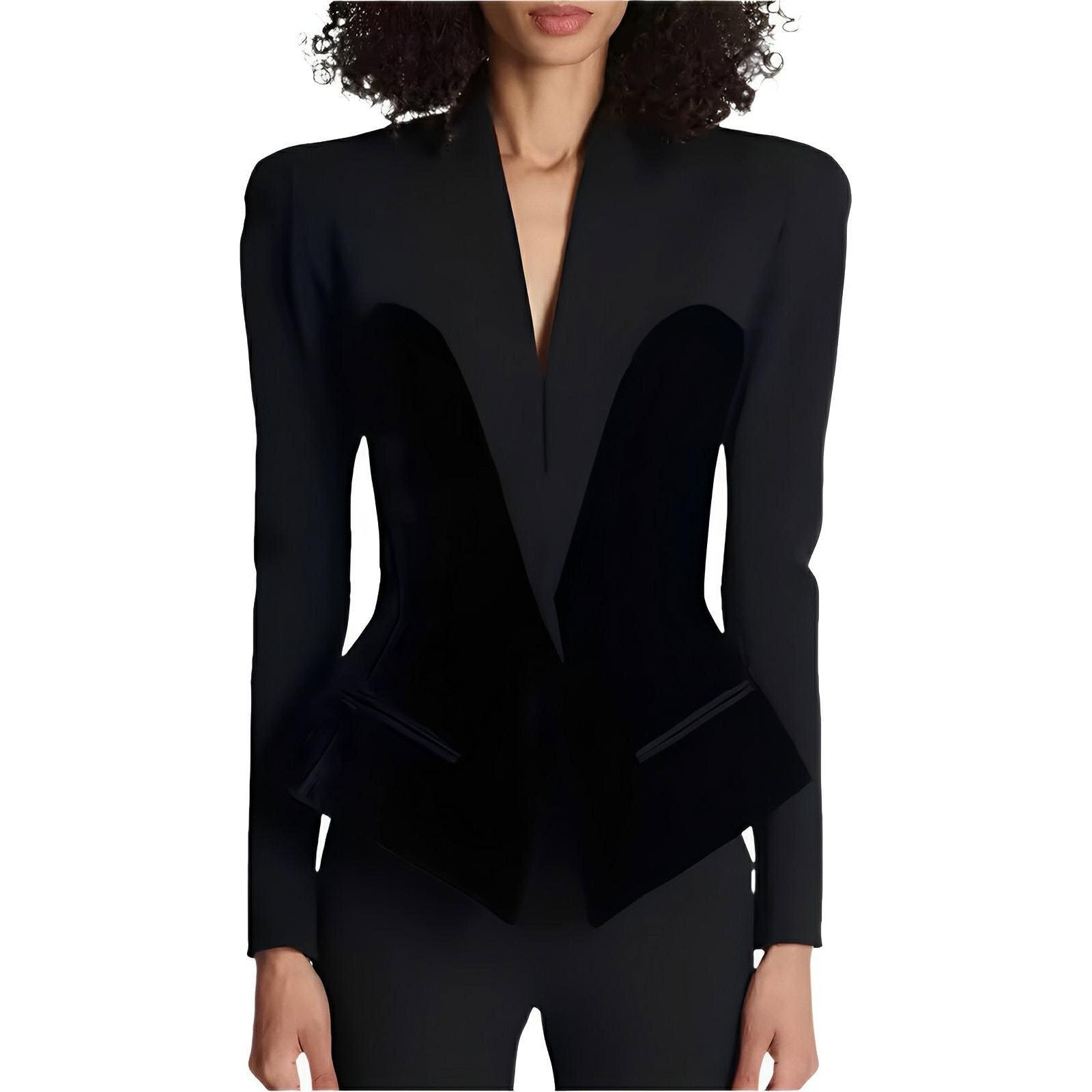This stylish blazer features a modern and edgy design, characterized by a tailored fit and cropped hem. The blazer has a sleek, open neck and notched lapels, enhancing its contemporary appeal. It presents a fitted silhouette that flatters the figure, making it ideal for both formal and semi-formal occasions. The overall look balances sophistication with a touch of avant-garde flair. Be exclusive.