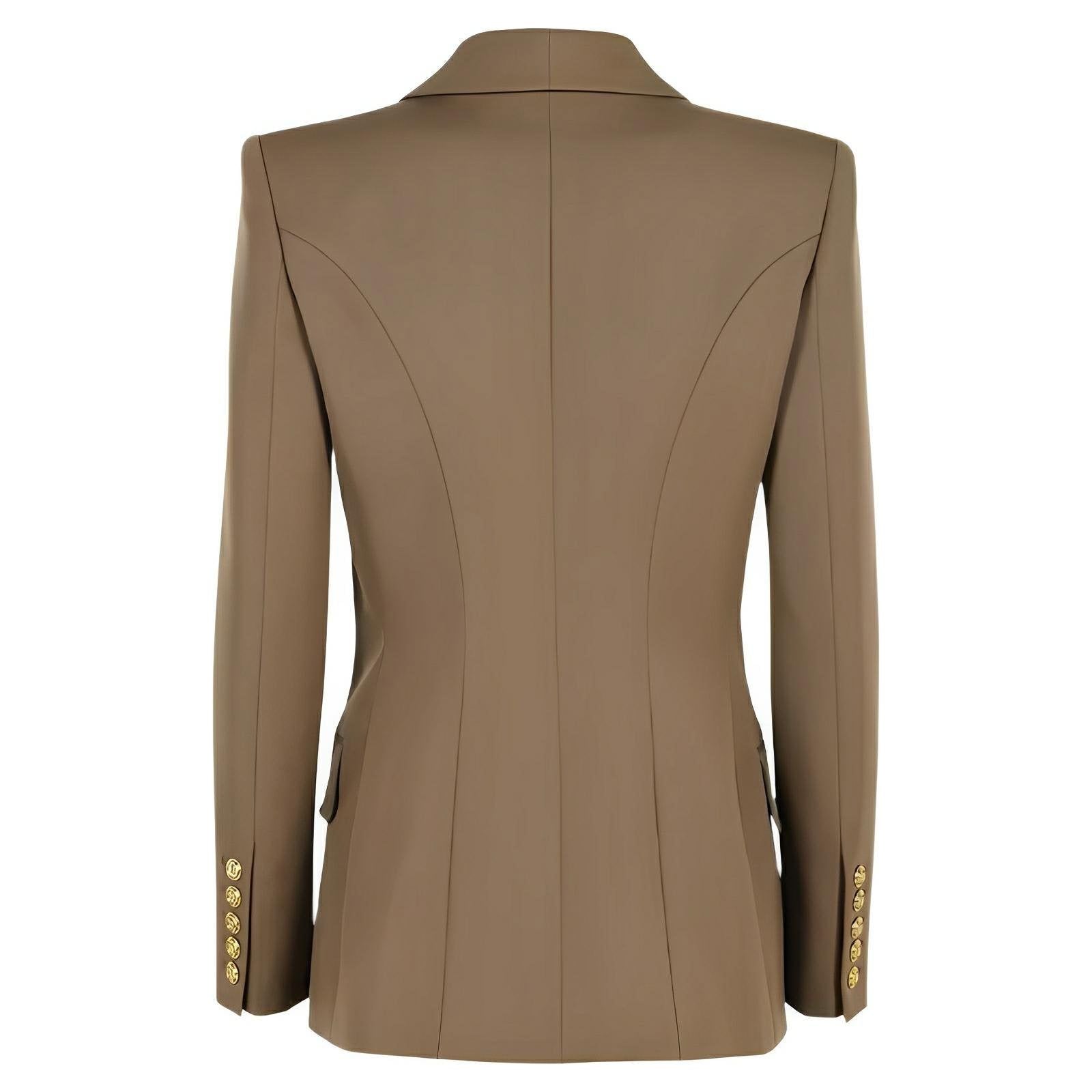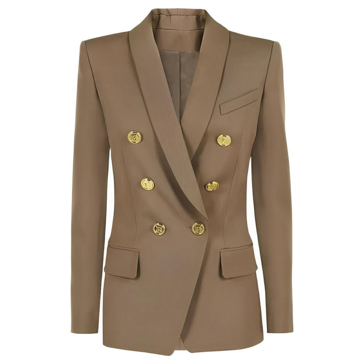 This tailored double-breasted blazer features a classic lapel collar, and is adorned with polished metal buttons, exuding a sophisticated aesthetic. The fit is structured, providing a flattering shape that can be dressed up for formal occasions or down for a smart-casual look. Command attention.