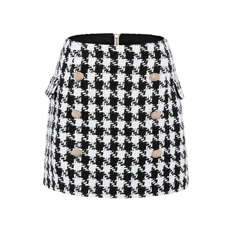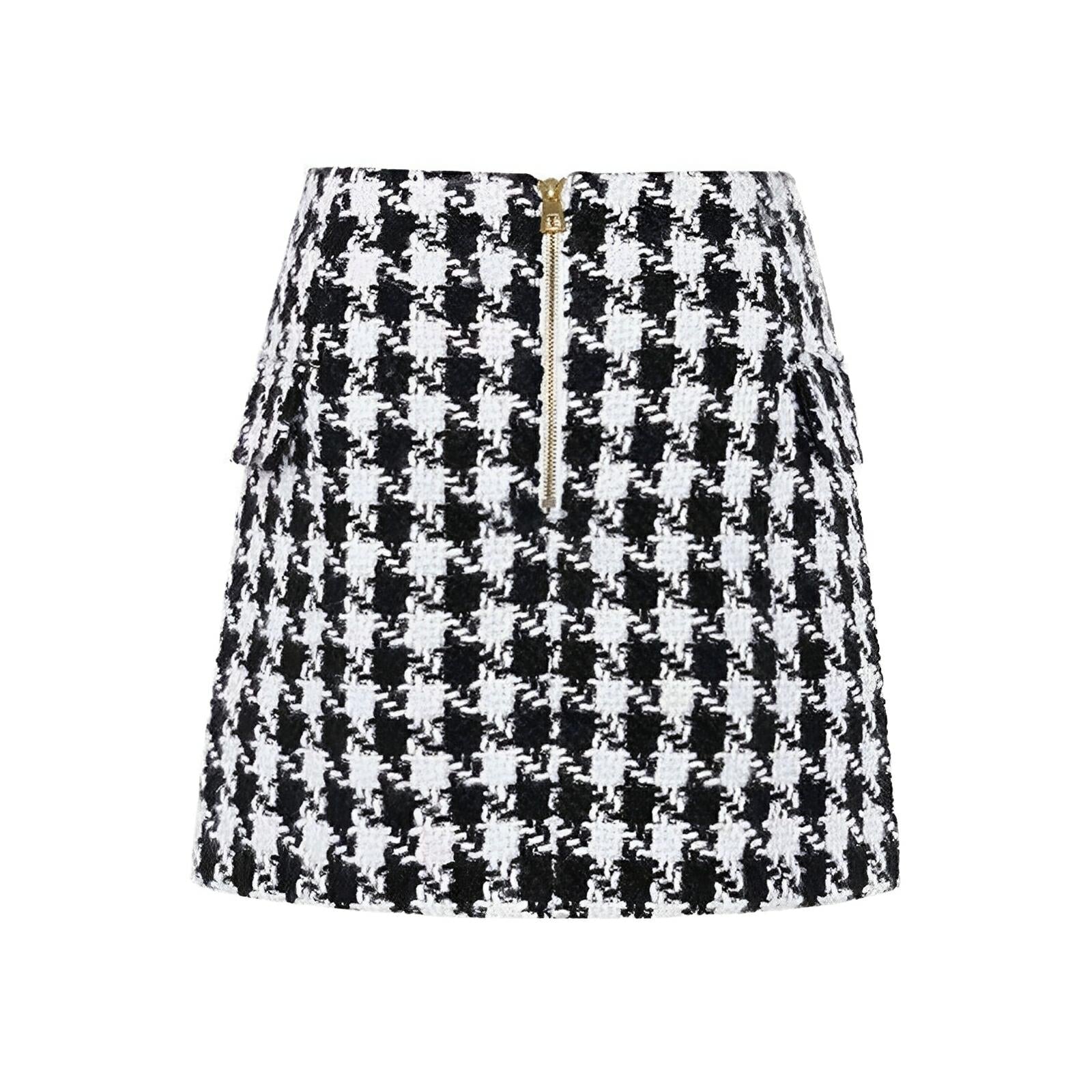 This stylish houndstooth skirt features a structured silhouette, giving it a flattering shape that is both chic and sophisticated. It closes at the back with a discreet zipper, ensuring a clean finish. This piece is versatile enough for both formal and casual occasions, pairing well with various tops and footwear. Complete your look.