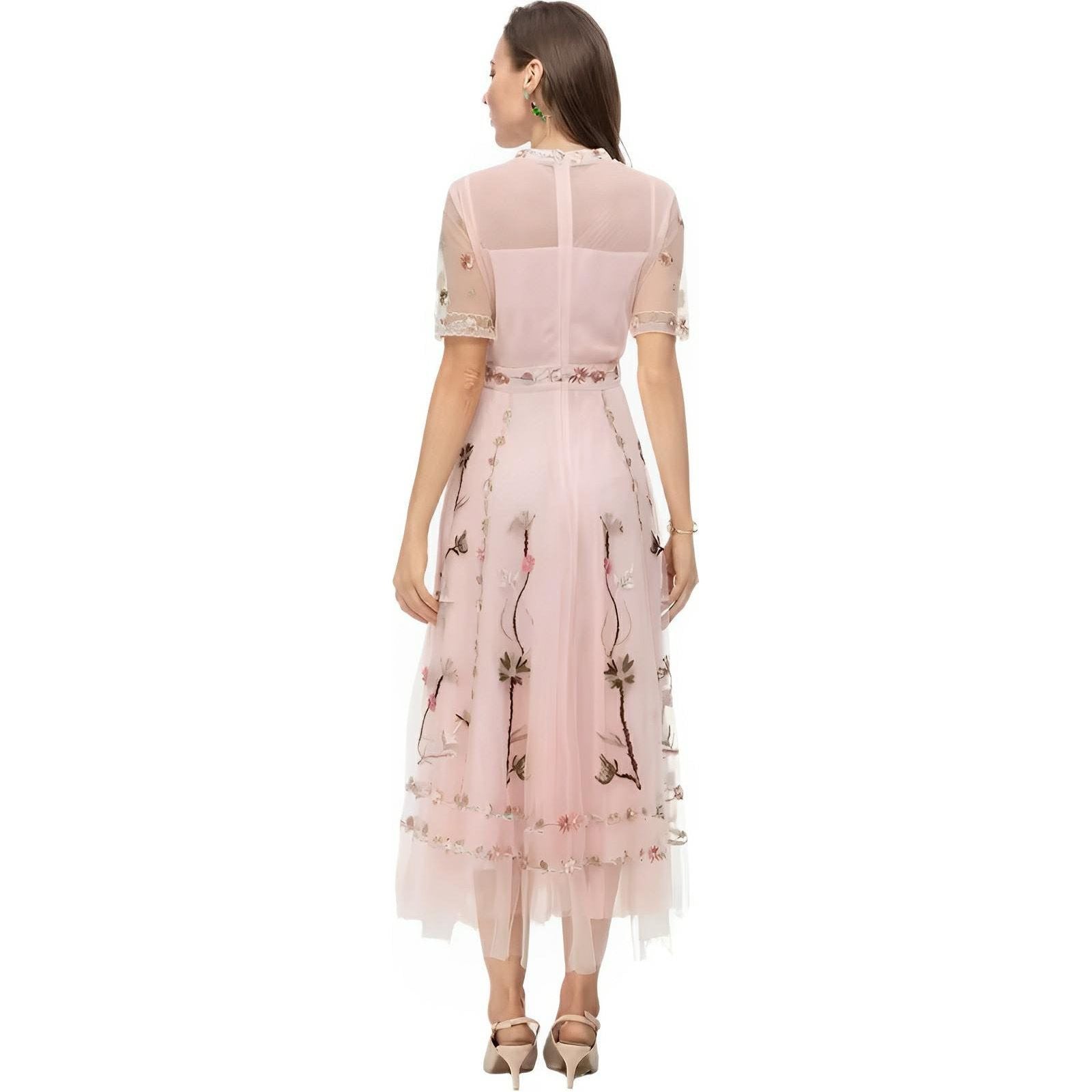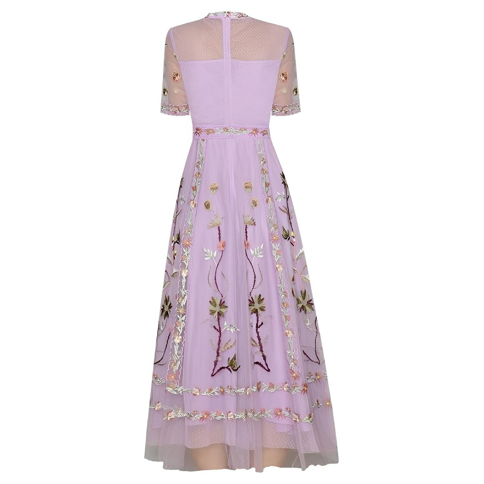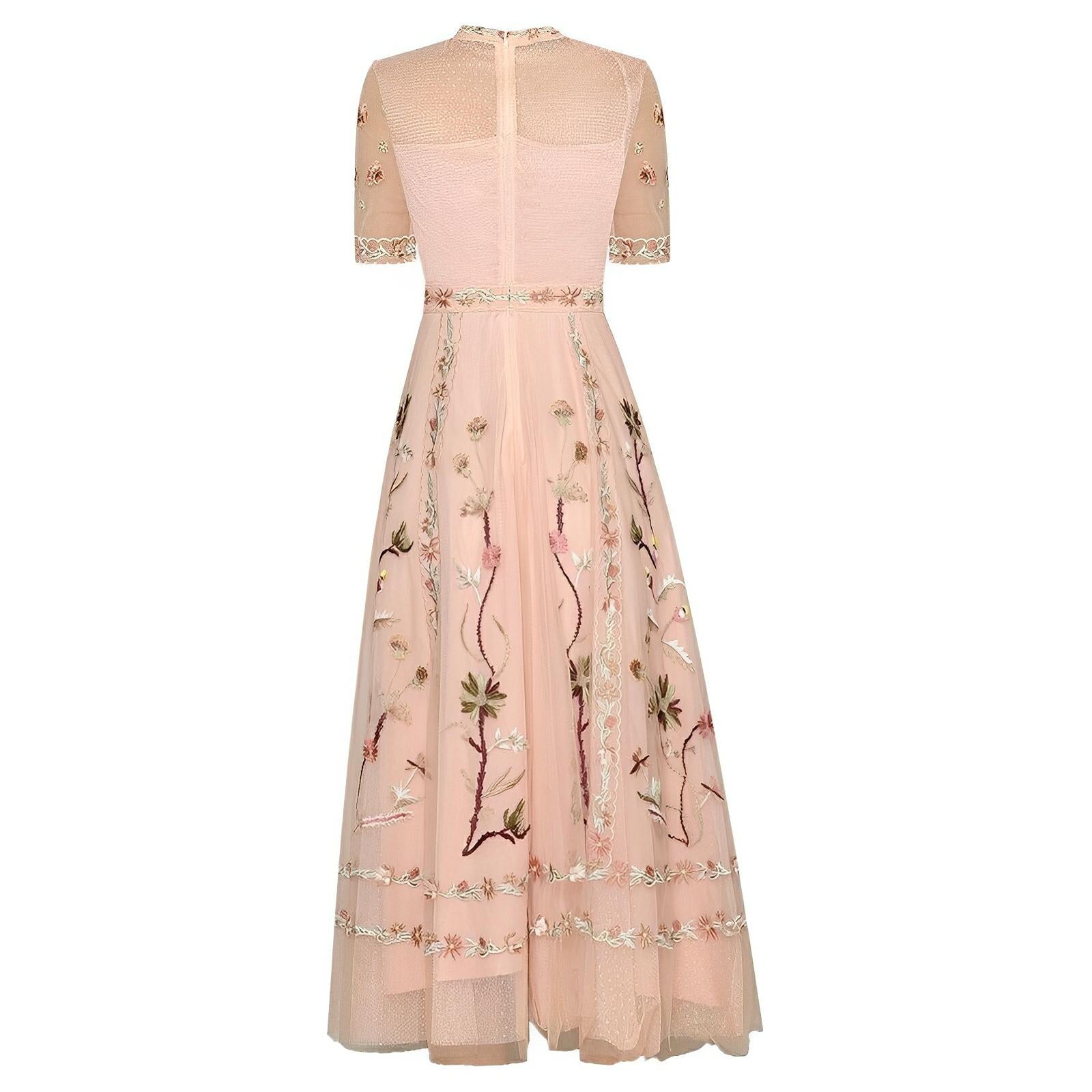 This enchanting gown features elegant short sleeves with embroidered motifs adorning both the bodice and skirt. Flowing gracefully to a mid-length hem, the skirt is embellished with more embroidered motifs and delicate lace trim at the base, lending an ethereal quality. This dress is perfect for formal occasions, adding a romantic touch to any event. Be unforgettable.