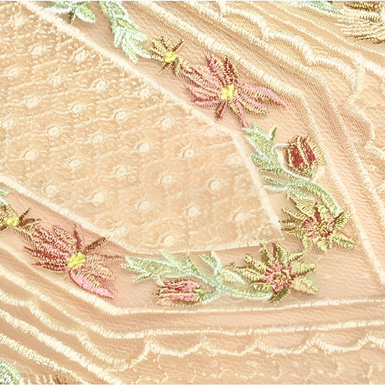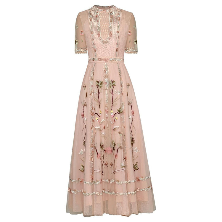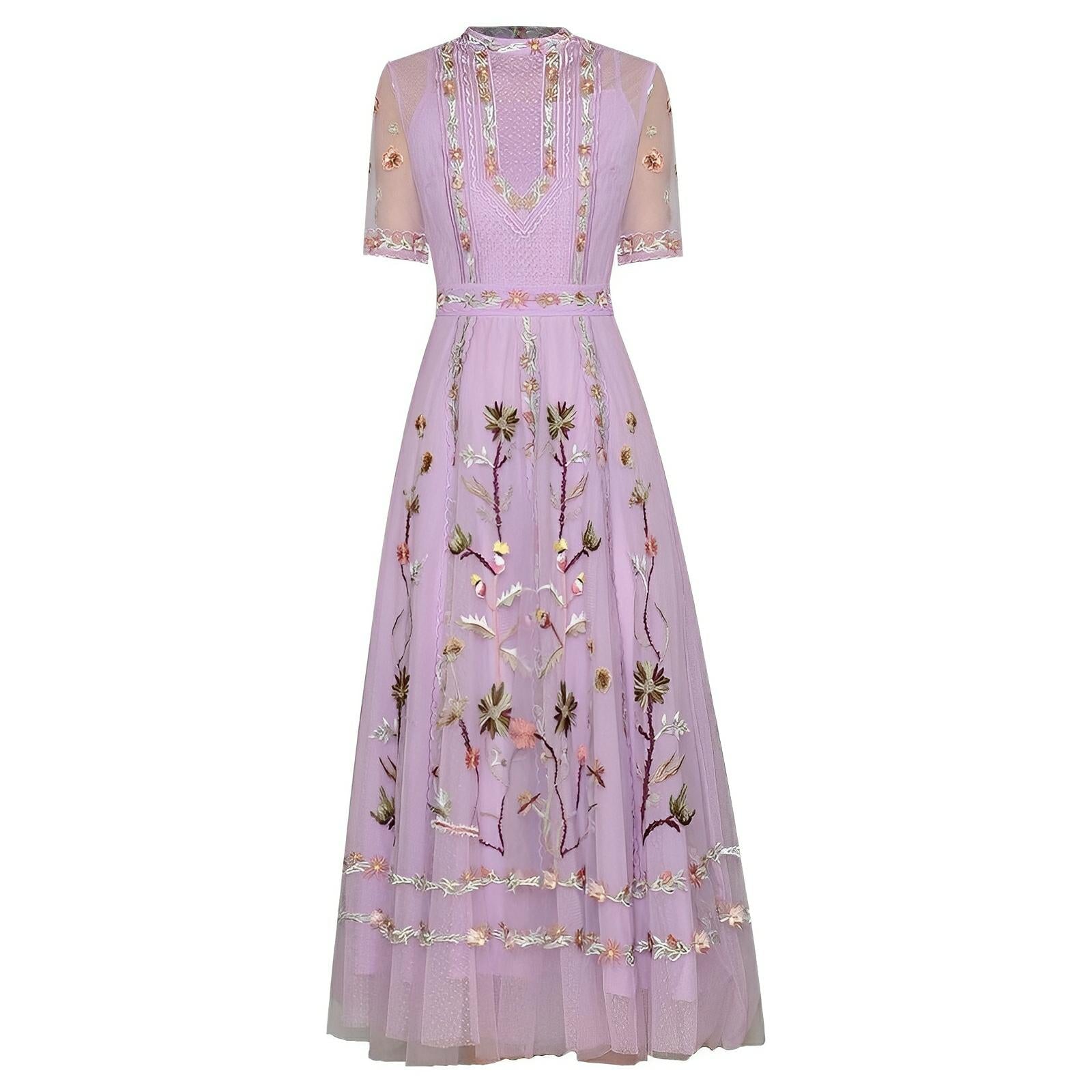 This enchanting gown features elegant short sleeves with embroidered motifs adorning both the bodice and skirt. Flowing gracefully to a mid-length hem, the skirt is embellished with more embroidered motifs and delicate lace trim at the base, lending an ethereal quality. This dress is perfect for formal occasions, adding a romantic touch to any event. Be unforgettable.
