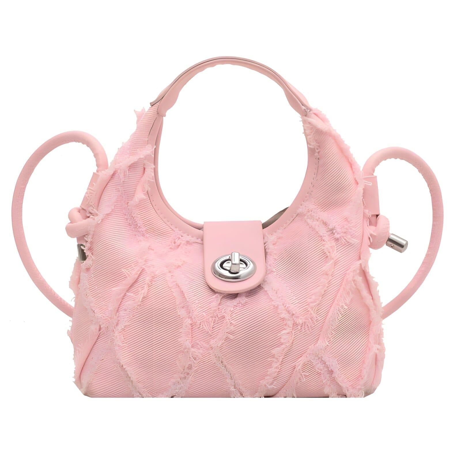 This unique handbag features a contemporary design adorned with intricate frayed detailing for a lush finish. An accent shoulder strap provides a stylish and functional touch, allowing for easy wearing, while the sleek clasp ensures secure carry. The overall design exudes a playful yet sophisticated charm, making it perfect for casual occasions or evening outings. Accessorize your look.